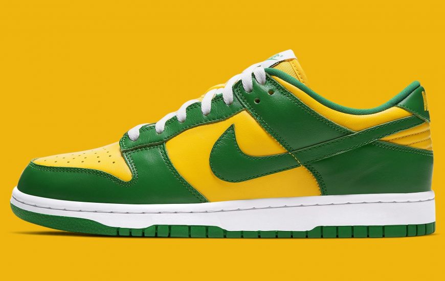 The Nike Dunk Low SP Brazil pair was release May 21st after much anticipation. Word going around is more colourway will be released later in the year in “Varsity Maize/Pine Green-White,” “White/University Red,” and “University Orange/Marine” colour schemes. The upper debuts the South American country’s signature colours, using the vibrant Varsity Maize for the unders and the complementing Pine Green for the overlays. Thin mesh tongues match the former shade, while its applied laces and branded patches depart by way of white neutrals. The “Nike Air” insignia dress in green just atop to round off the palette alongside the same-toned outsole.