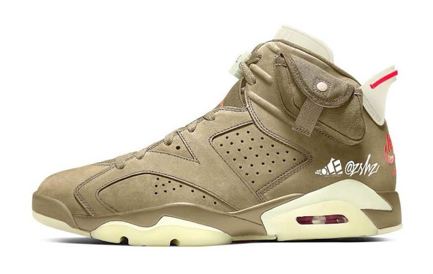 Rumour going around says a new colourway for the Travis Scott x Air Jordan 6 will be released early next year. The pair will effectively follow the template of the original, only adding subtle tweaks to the militaristic colouring. Instead of the deep olive that was once used, it seems as mock-ups would attest that a much lighter, near faded Khaki will take its place. However, Crimson branding is still intact as it dresses the embroideries at the heel as well as the decal spaces above. Pulls, tongues, and even the toggle along with the lace unit also seem to dress just a bit lighter matching that of the tooling’s likely glow-in-the-dark Sail fixtures.