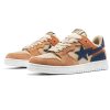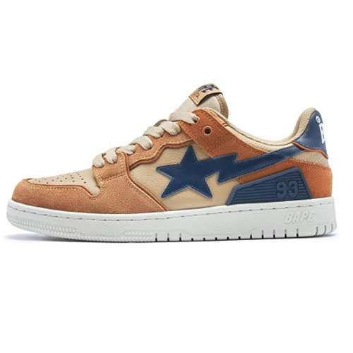 This A Bathing Ape Bape sneaker is amongst the urban fall collection and here is the SK8 STA #4 in beige. The shoe upper features brown leather and suede for warm feet always.