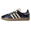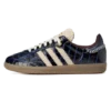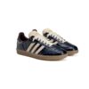 The Adidas x Wales Bonner Samba Sneaker in Navy/White exemplifies a harmonious blend of classic design and contemporary luxury. This iteration features a faux crocodile leather upper, providing a sophisticated texture that elevates the traditional Samba silhouette. The woven leather tongue and decorative box stitching around the heel counter add artisanal touches, reflecting Wales Bonner’s commitment to craftsmanship. The deep navy hue is complemented by crisp white accents and subtle night red details, creating a colour palette that is both timeless and modern. This adidas x Wales Bonner navy/white samba collaboration not only pays homage to Adidas’s rich heritage but also infuses it with a fresh, elevated aesthetic, making it a standout choice for those seeking style and substance in their footwear.