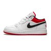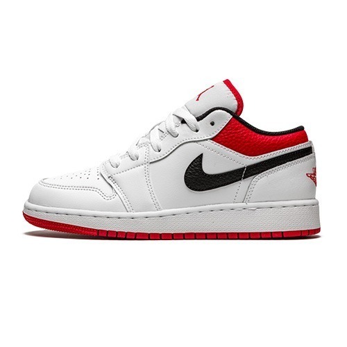 The Air Jordan 1 Low University Red feature a white tumbled and smooth leather upper paired with Red contrasting accents throughout. A Black Swoosh on the sides atop a Red rubber outsole completes the design.