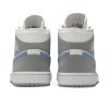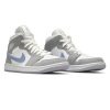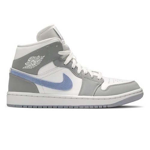 The Nike Air Jordan 1 Mid Wolf Grey Aluminium features a grey suede overlays and a pale blue Swooshes and matching icy soles. Also, white leathers balance the palette, appearing along the toe, mid-panel, collar, and the branding that sits atop both the ankle flap as well as the tongue.