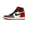 This pair of Air Jordan 1 Retro High Bred Toe stays true to the classic Black Toe blueprint but adds a red toe box instead of a white one—hence the “Bred” portion of the nickname.