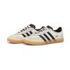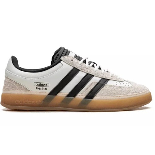 The Bad Bunny x adidas Gazelle Indoor ‘Core White’ features a blend of off-white leather and matching hairy suede on the forefoot overlay, eyestay, and heel. The design is accented by serrated black leather three-stripes, with branding details like ‘adidas benito’ stamped on the side and a size label stitched on the heel. The shoe is finished with a translucent gum rubber sole, providing solid traction.