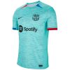 The Nike Barcelona 2023/2024 third jersey is notable for its vibrant light aqua hue, symbolizing inspiration and creativity. Its design encapsulates the essence of Barça, encompassing its rich history, distinctive playing style, and emerging talents nurtured at La Masía, whose journeys serve as global inspiration. It introduces an avant-garde and inventive aesthetic through its unique design and harmonious blend of colours. This includes a background pattern that forms a blue and garnet motif, reminiscent of FC Barcelona’s DNA, which extends across the entire fabric.