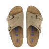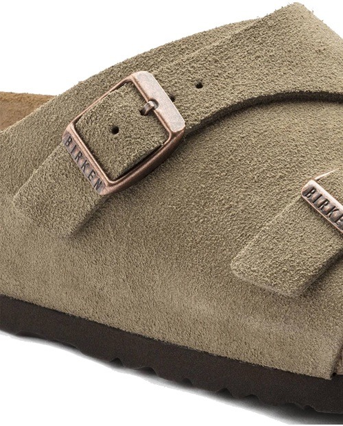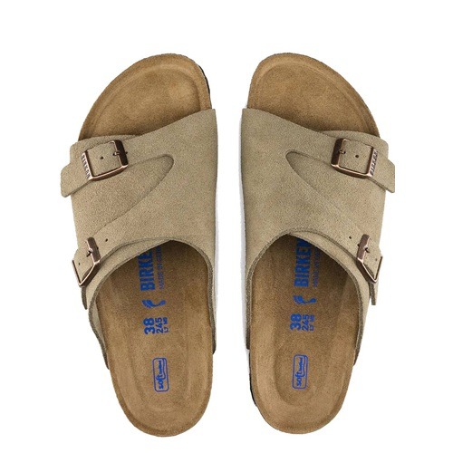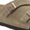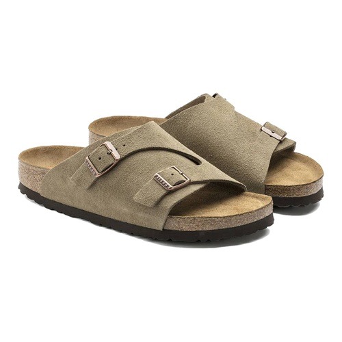 This Birkenstock Zürich suede sandal in taupe blends the support of a closed shoe with the airy feel of a sandal, appealing to both men and women alike. While it features closed sides, the design is open at the toes and heel to allow ample ventilation for the feet. Its natural look is achieved through the use of particularly soft suede for the upper, which fits the foot snugly like a second skin.