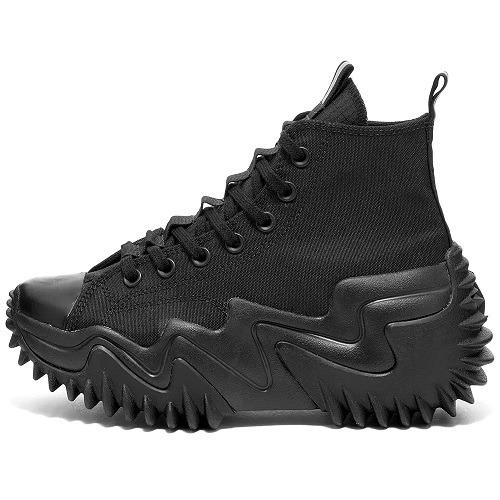 The converse run star motion platform in triple-black is inspired by the JW run star hike. This pair features a CX foam midsole to help bring next-level comfort to every stride. The upper stays true to the original, juxtaposed with future-forward design details for bold self-expression. An exaggerated, wavy platform and sculptural traction lugs raise you up and keep you steady with standout traction.
