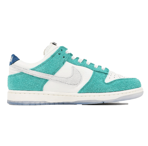 This Nike Dunk Low x Kasina ‘ Road Sign ‘ was inspired by travel in Korea. The neptune green pair features the colors generally found on the signs when driving through the Gyeongbu Expressway, which is the main highway between Busan and Seoul. Built with a leather base, the upper is overlaid by Neptune Green suede, with grey suede on the Swoosh branding. A hang-tag adds to the thematic look, while the lateral heel sports Kasina’s logo, with the tongue tag sporting the retailer’s name in Korean characters.