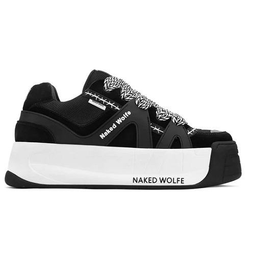 This trending Naked Wolfe Slide Black Sneaker has skateboard wear potential. The pair features leather, suede and mesh upper featuring barbed wire tape, and moulded 3D rubber side panel moulds. Also, a 3D bubble “Wolfe Head” Plaque on the heel also has two pairs of extra thick ’90s-inspired custom-designed shoe laces.