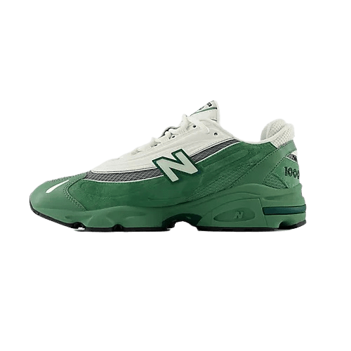 The New Balance 1000 “Mallard Green” sneakers, blend retro aesthetics with modern performance. The upper combines leather, ripstop mesh, and suede in white, grey, and green hues, featuring the signature ‘N’ logo and ‘1000’ branding. The green foam midsole incorporates ABZORB cushioning in the heel and forefoot for enhanced comfort, while the black rubber outsole includes a Stability Web shank for added arch support.