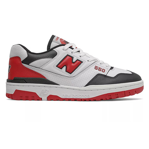 The New Balance BB550 was released in three colourways and here we have the white/red. This pair features crisp white leather uppers paired up with synthetic heel collars and comes balanced out with solid black. Also, can be seen are accents that tumble onto the moulds towards the lower heel, leather overlays that dress up the toe box the trim around the throat and the overlays that sit closest to the ankle. The bursts of titular hues show face on the “N” logos, tongue branding, heel overlays, “550” forefoot notations and outsoles.