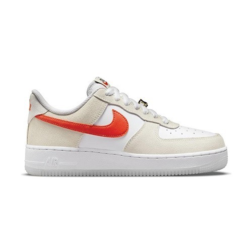 This Nike Air Force 1 ’07 SE in Summit White Orange pays homage to the brand’s iconic swoosh logo with unique, vintage-inspired branding. First Use June 18, 1971” text below a white outline Swoosh on both sides. More “1971” detailing also appears on the insoles and a decidedly retro orange “Nike” logo is embroidered onto the heel. A classic “Nike” insignia with an orange Swoosh is found on the white nylon tongue tag. A gold Swoosh lace dubrae is incorporated in the design of the white shoelaces. Nike situates a blazing orange leather Swoosh on the lateral side of the shoe. White leather can be found on the perforated toe and mid-panel. Contrasting Light Bone suede overlays on the forefoot, eyelets, collar, and heel