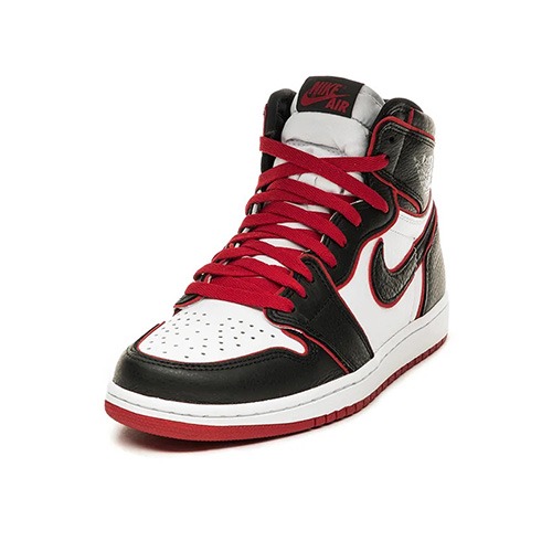 This pair of Nike Air Jordan 1 Retro High OG Bloodline was inspired by the TV commercial ‘Who Said Man Was Not Meant To Fly’. This shoe features a black, Red and White colour scheme. Also, white leather is on the side panels and toe, offset by the black leather noted on the overlays.