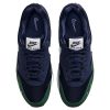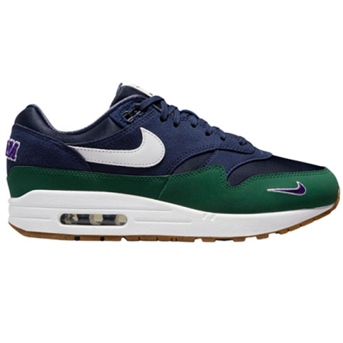 You can not go wrong with this clean pair of  Nike Air Max 1 ’87 Obsidian. This sneaker features a mix of obsidian, midnight navy, and gorge green above a classic white midsole and gum bottom combination. Also, the upper is built with a pleasantly standard mix of suedes, leather, and mesh, while the varsity jacket patchwork appears via the NIKE lettering at the heel and the forefoot Swoosh logo.