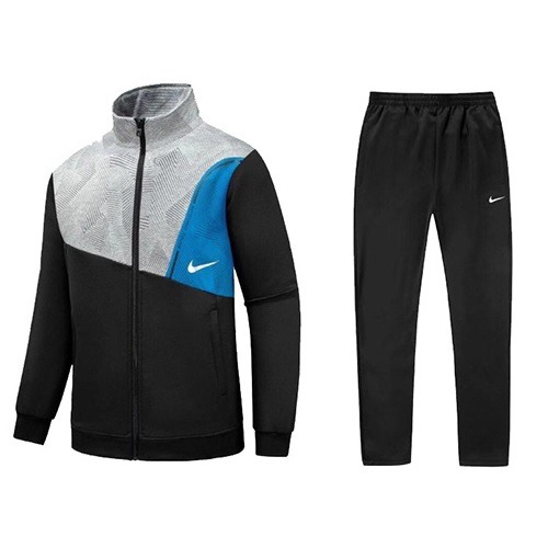 This Nike Fleece Full Tracksuit as seen comprises of grey, blue, black colour design. It is made from soft fleece fabric for an ultra-comfy and warming wear. The track top has a full front zip, split pocket, and mock neck, while the matching joggers have ribbed trims for the perfect fit. Finished with white Nike Swoosh branding to the chest and left thigh.