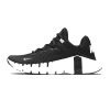 The Nike Free Metcon 4 Black/White shoe is manufactured with durability and performance in mind. The pair features upper black and wide heel creating a solid base for lifting. A softer foam core cushions your foot, while a firmer outer layer is durable and stable. Also, wide internal webbing distributes pressure around your midfoot for a comfortable-yet-locked-in feel during sudden stops and quick cuts.