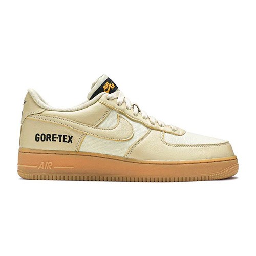 The Nike Air Force 1 Low Gore-Tex in gold is built with durability in mind-to last a live time. This pair features a leather upper which is finished in a neutral tan shade. Also, it is reinforced with a waterproof Gore-Tex lining to keep feet warm and dry. Lastly, the black woven tongue tag is complemented by matching black branding hits, including Gore-Tex embroidery and Nike Air lettering on the heel tab.