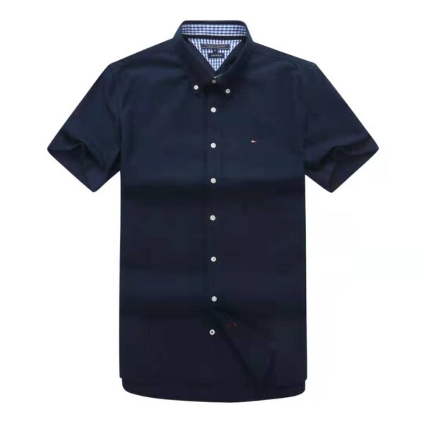 This is an all-time classic Tommy Hilfiger Short-sleeve Oxford Navy Blue Shirt. This poplin shirt is crisp, soft, and irons in a jiffy (making life a lot easier). A spring plaid print distinguishes it from your standard stripe or solid.