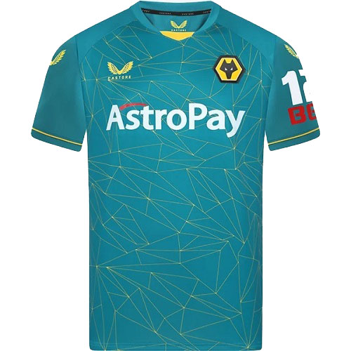 The official Wolverhampton Away Jersey for the 2022/2023 season is here to cheer your favourite team in. This shirt is inspired by the iconic beams and structure of the Billy Wright Stand at home ground Molineux Stadium. The primary colour teal is also a nod to the popular away kit worn from 1996-1998.